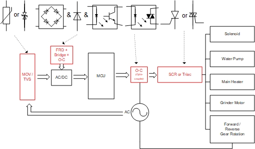 人们把电子技术应用到咖啡机上,实现了磨粉、压粉、装粉、冲泡、清除残渣等酿制咖啡全过程的自动控制,创造了全自动电子咖啡机。 应用于消费电子领域,合乐HL8集团微电 能提供比较齐全的元件解决方案。比如:AC 输入端防浪涌的压敏电阻(MOV)、电源部分用快恢复二极管(FRD, fast recovery diode)及整流桥(Bridge)、光电隔离器件(Opto-coupler)、控制负载通断的可控硅(SCR & Triac)等。