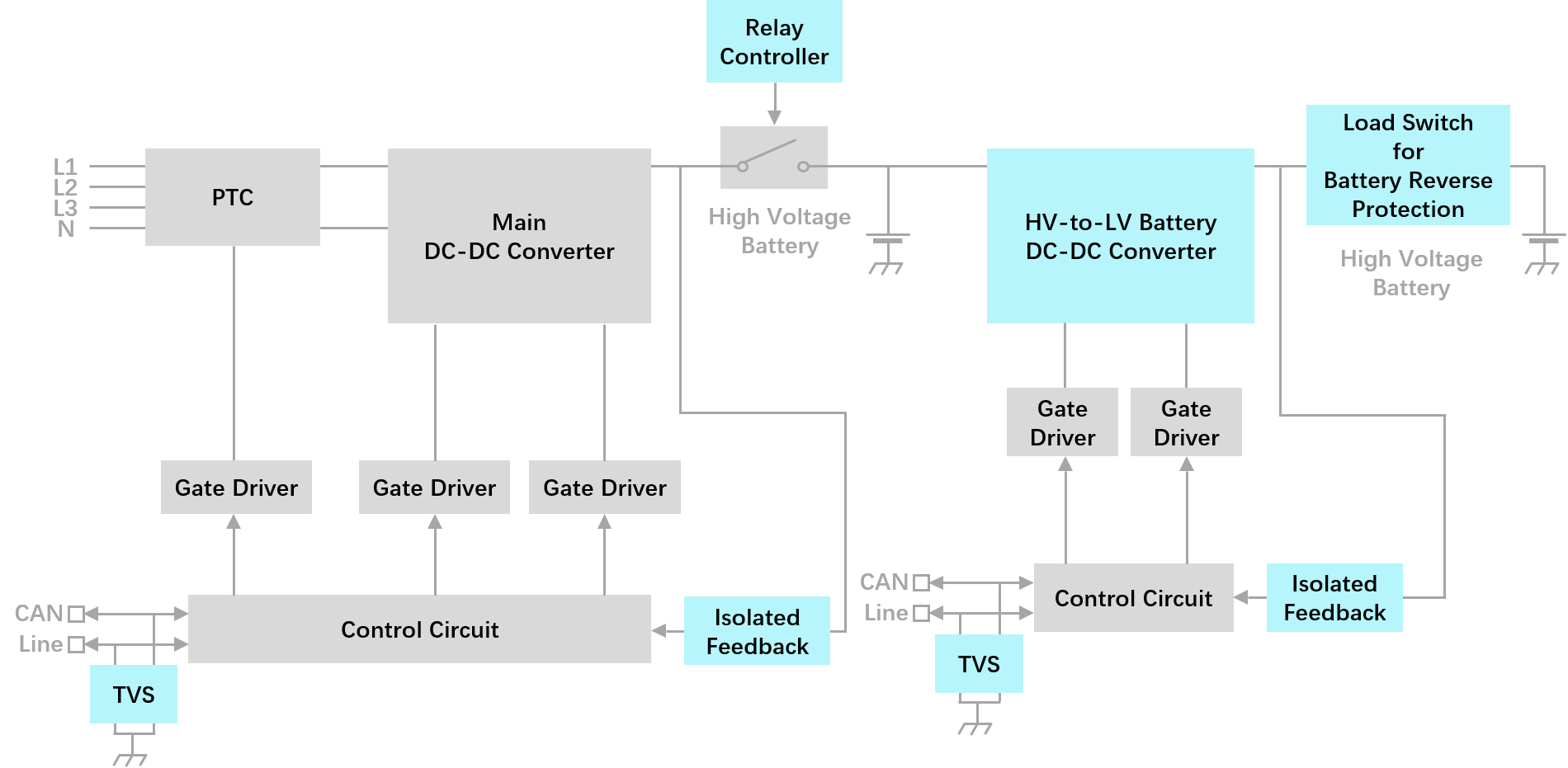 电网中的交流电通过交流充电桩直接给车载充电器 (OBC) 供电,OBC 把 AC 转换成 DC,然后通过配电箱为车内的动力电池充电。直流充电桩则包含许多 AC-DC 电源模块。从目前充电桩市场的状况来看,有 3 大趋势:宽范围的恒定功率、宽范围的输出电压、更高功率的模块。 两个主要功率级。首先,功率因素校正 (PFC) 级,保持输入电流和电压之间的相位关系,最大限度地减少线路/电网电流的总谐波失真 (THD) 。这有助于减少任何浪费的无功功率,提高整体能效。 第二功率级是 DC-DC 转换器,它从 PFC 级获得 DC 输出,并将其转换为电池充电所需的电平。转换器的输出电压和电流基于电池的整体健康状态和充电状态随时间变化。 不论是功率因数校正(PFC)、原边侧 DC-DC、或二次整流,合乐HL8集团微电都具有相应的解决方案,汽车系列产品涵盖二极管、MOSFET、TVS 等各类产品。比如:整流+LLC 构成了充电桩的基本电路,可采用 FRED(快恢复二极管)方案;CAN 通讯口的 ESD 保护。