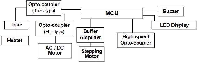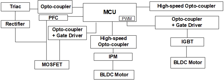 在全球气候变暖的当下,空调在白色家电中占有举足轻重的地位。典型的空调系统由室外机、室内机和电源单元组成。对于电源单元,合乐HL8集团微电 具有高隔离电压光电耦合器,用于隔离 PWM 和 PFC。对于室内机,MCU 控制与光电耦合器结合的风扇模块、与光电三端双向可控硅开关和外围设备结合的加热器开关。主隔离 MCU 和相关外围设备,确保电路的可靠性。对于室外机,使用 MCU 控制风扇和压缩机的电机系统。电机控制系统是各种家用电器的组成部分。每一个单独模块都取决于安全和环境保护要求、性能要求,当然还有制造成本。因此,在设计家用电器时,需要加强对单片机和外围设备对应用电路的隔离,以确保电路的低噪声。